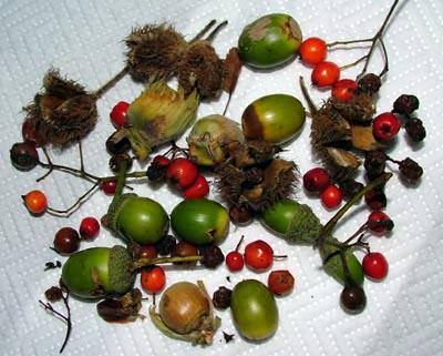 | Here's just a selection of the goodies we've harvested, Acorns, Beech masts, Hazel nuts and some Rowan berries. |