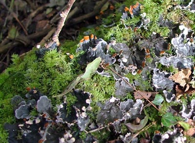 | We believe this to be Dog Lichen (Peltigera canina). It can be found on the horizontal branch at the back of the previous picture. |