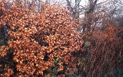The beech is one of the last trees in the woodland to shed its leaves, which is why it's often used as a hedging plant in peoples' gardens. Here is part of the hedge near the gate at Quoditch. |