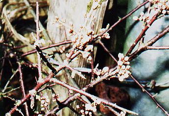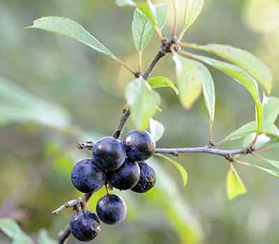 By September it has fruited, producing the sloe berries. The taste is rather sharp when compared with other fruits, but they can be turned into jam or used to produce sloe gin. Often the fruits are picked after the first frosts in October onwards, which mellows the taste. |